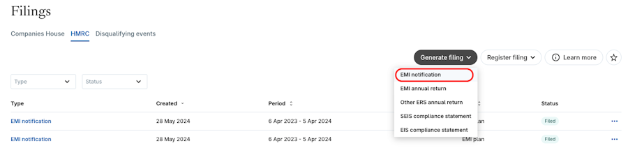 You can export an EMI Notification and it will contain EMI grants that have yet to be notified. The filing is generated using the HMRC template, filled with the data of each of your un-notified EMI grants.