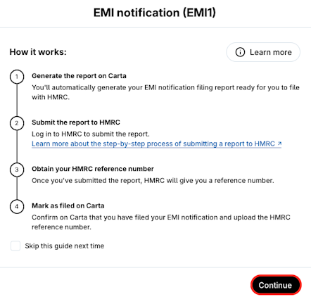 The Annual Returns is a compulsory filing that must be delivered to the HMRC on or before 6 July in a tax year. The Annual Return lists all relevant changes regarding your EMI, CSOP and Unapproved schemes within the tax year. You can generate the EMI Annual Return, CSOP Annual Return and Other ERS Annual Return in Carta.