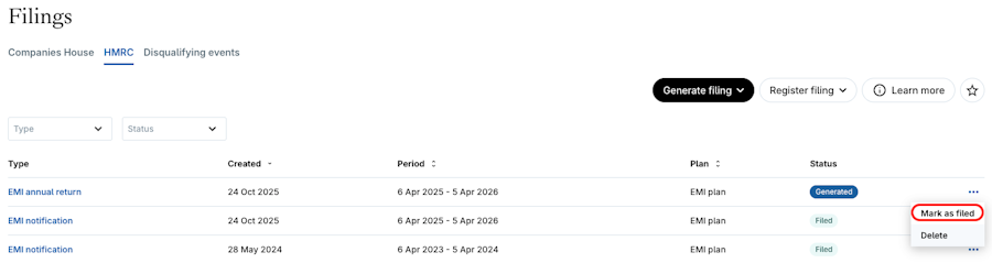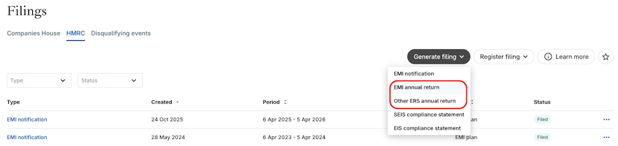Export and download HMRC filings for your EMI , CSOP and Unapproved plans.