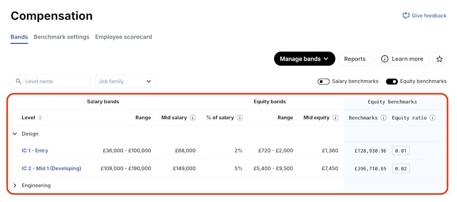 To edit Compensation bands (salary and equity ranges of the job families and levels you've already) or Job families and levels:
