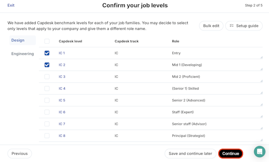 5. Configure your job levels: Select your job levels across all job families and confirm their role name. Mark the checkbox for the Carta levels that apply to your company and modify the Role name if applicable. Click Continue.