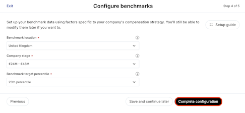 7. Configure benchmarks: Set up the parameters of the industry-standard benchmarks you want to use for your equity compensation. Click Complete configuration.
