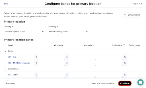 6. Configure your bands: Set up your primary location, which is often your headquarters location or where most of your employees are located and then add the salary and equity bands of your primary location. Click Continue.