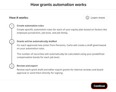 Create specific automation rules for each of your equity plan based on factors like employee jurisdiction, job level, and job family. For each approved new joiner from HR Integration, Carta will create a draft grant based on your automation rules and the number of securities will automatically be calculated using your predefined compensation bands for each job level.