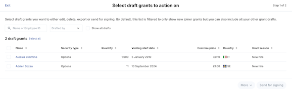 2. Select the grants you want to action on by marking the checkboxes. Then, either click Send for signing or click More to Edit, Export or Delete.