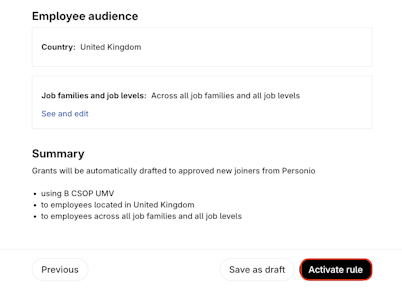 5. Review the Summary and click Save as draft or Activate rule.