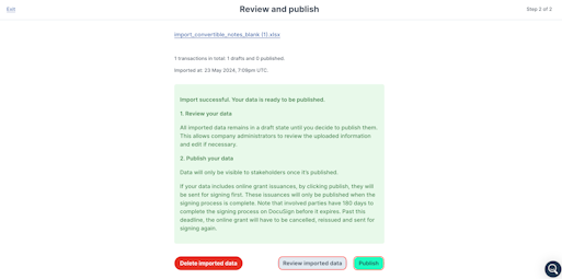 5. Carta will check if there are any errors with the import file. If no errors are found you will be able to Delete imported data, Review imported date or Publish.
