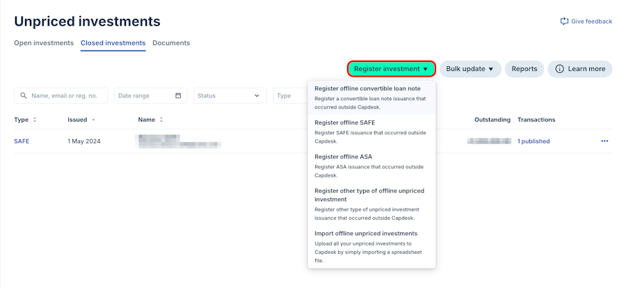 If this is the first time issuing convertible loan notes on the platform, make sure to enable the relevant equity add-on - once enabled, you should find it under Fundraising > Unpriced investments > Closed investments.