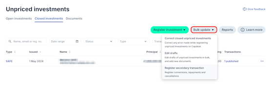 1. Navigate to Fundraising > Unpriced investments > Closed investments and click Bulk update > Register secondary transaction.