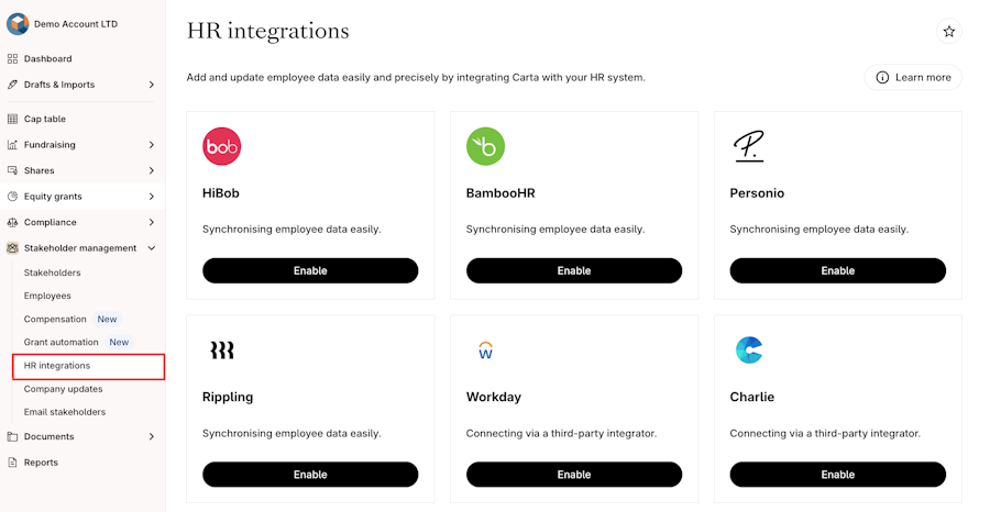 Carta allow you to sync your company's employee data from your HR system, saving you time when issuing equity grants.