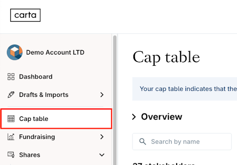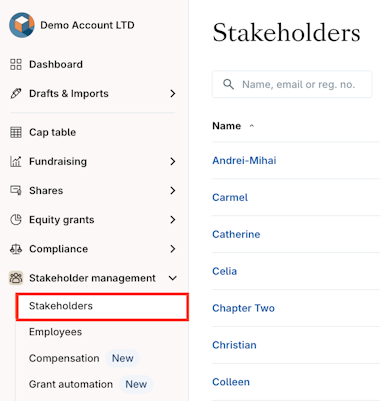 4. It is also possible to re-invite stakeholders from the Cap table page. In the main menu, navigate to Cap table.