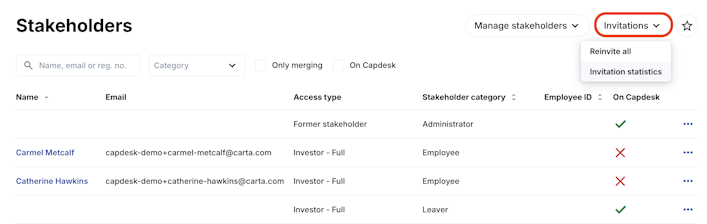 Carta allows you to re-invite individual shareholders or send a bulk invite to all who have not yet signed up.