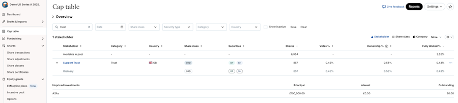 1. The EBT must be set up as a stakeholder in your cap table. You will also need to issue shares to it as these shares will be the authorised pool for your EBT from which you can issue grants from. Go to Shares > Share transactions.