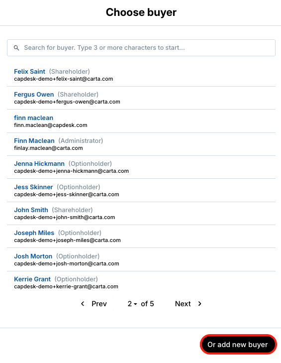 3. Select the trust from the list of stakeholders or create the trust entry in your cap table by clicking Or add a new buyer.