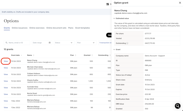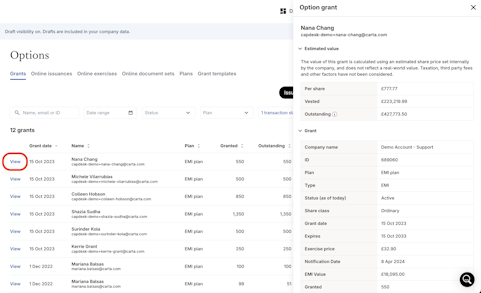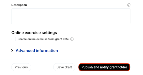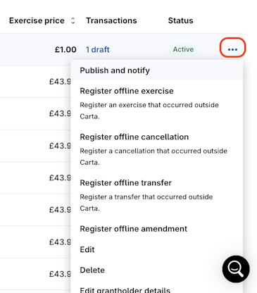 7. Draft option grants can be published by clicking on the three-dotted button located on the right-hand side of the award and Publish and notify. That will trigger a notification to the grantholder.