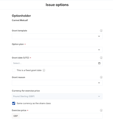 4. Enter the details related to the option grant. The required details (marked with a red asterisk on the platform) will vary according to the equity type. The details can include: