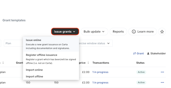 Offline equity awards issuance - an offline issuance can be used when the signing process will take place outside Carta (i.e. the agreements have already been signed).