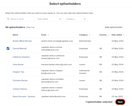 3. Select an existing holder or click on Or add a new optionholder. If a new optionholder is created, it will be necessary to add holder details, such as name, email, stakeholder type, stakeholder category, etc. Click Next.