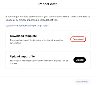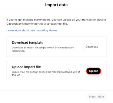 Shares issuances can be easily reflected in the platform individually or in bulk, with the aid of an import file (excel spreadsheet). All shares are linked to a share class, so make sure that you already have a share class created.