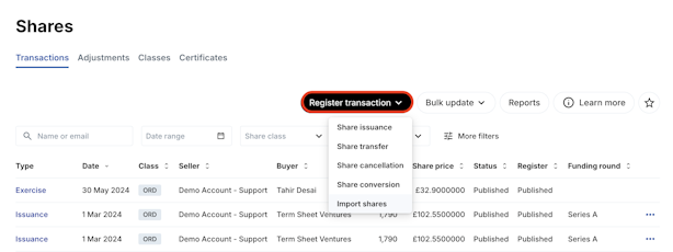 2. Click Register transaction > Import shares.