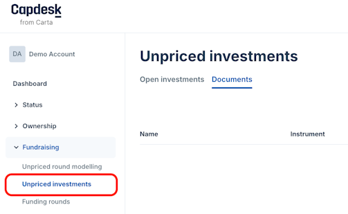 1. Navigate to Fundraising > Unpriced investments > Documents.