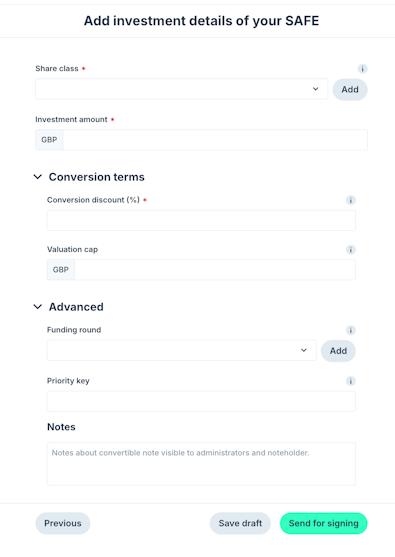 3. Add investment details of your SAFE.