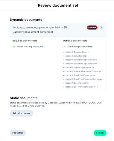 A document set is a group of documents you can reuse in online issuances with dynamic documents, which are reusable templates with Carta placeholders that Carta fills in with personalised data for each investor, as well as static documents which do not require personalisation.