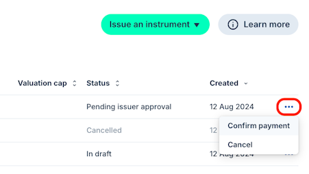 6. Once signed by both parties, the SAFE will be Pending issuer approval. Click the action menu to the right of the instrument to Confirm payment.