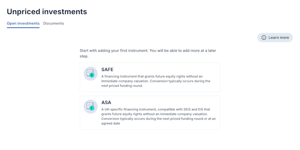 2. In the Open investments tab select which instrument you will issue: SAFE or ASA.