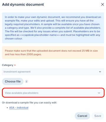 In order to make your own dynamic document, we recommend you download an example file, make your edits and upload. You can also find a list of available, required and optional, placeholders by expanding the View available placeholders menu.