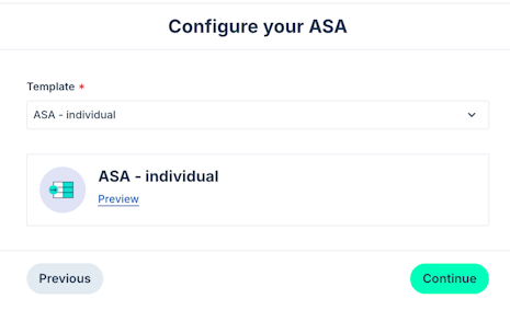 2. Select the template that will be used to issue the ASA. Once a template is selected you are able to preview the document. Click Continue to proceed.