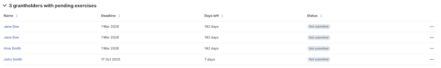 You can also click Manage exercises to perform actions in bulk such as opening exercise windows, terminating grants and mark exercises as paid.