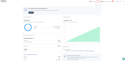 Like the Holdings tab, Grants will only be displayed if you are a grantholder at a company. If you hold shares and grants, both tabs will be displayed. Find more about the Employee Dashboard here.