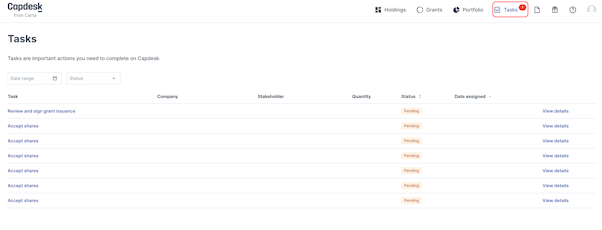 The Tasks tab will show as pending tasks you might have on your Carta account such as share acceptances, option grants that need to be accepted/signed, etc.