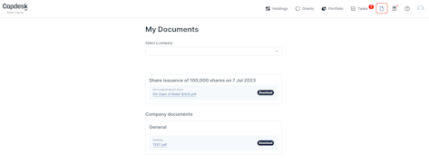 Clicking the Documents tab will redirect you to the documents page that will contain all documents related to your transactions (if uploaded by the issuing company) and also any company updates shared.
