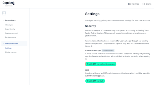 From this page it is possible to enable a 2FA authenticator method.