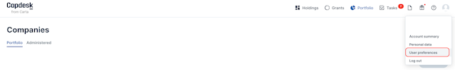 Click the silhouette icon and then User preferences to access the personal settings settings of your account.