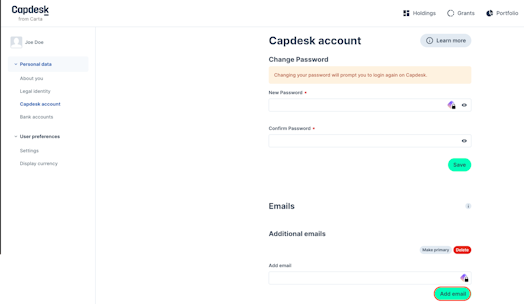 Click Carta account to change your password and/or add multiple emails to the account.