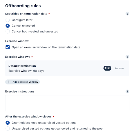 The offboarding rules can be set up when creating an Equity Plan or by editing the Equity Plan.