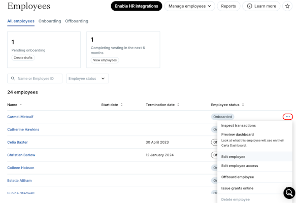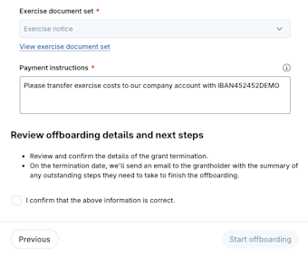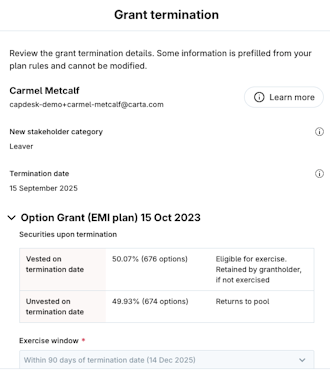 The offboarding process allows you to efficiently offboard grantholders using the standard rules defined in your equity plans.
