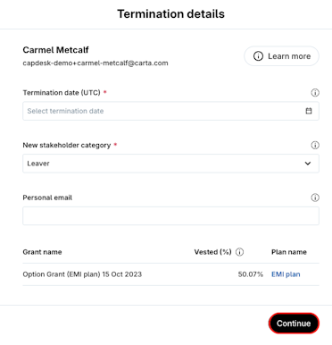 • Personal email: not a mandatory field, the personal email address is used to help the grantholder retain their Carta account after offboarding. Once you've started or scheduled this offboarding, we'll send an email to the grantholder asking them to confirm this address as their new email to log in to Carta.