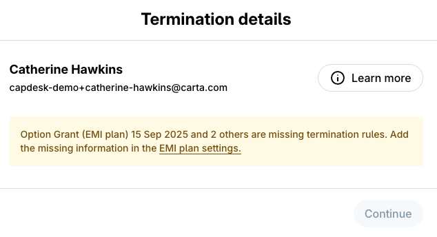 3. If the plan has no termination rules set, you will be prompted to edit the plan and add the Equity Plan Offboarding Rules.
