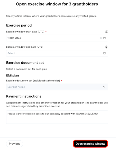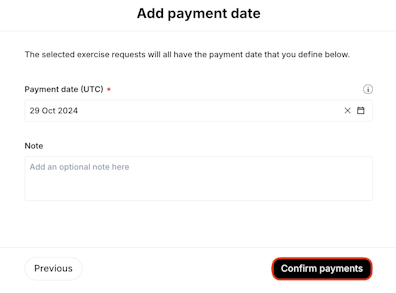 3. Add the payment date that will apply to all exercise request and click Confirm payments.