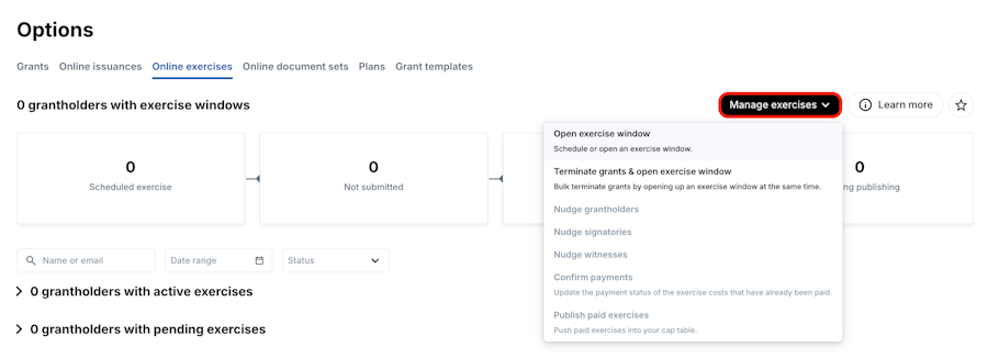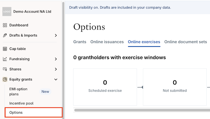 1. Navigate to Equity grants > Options > Online Exercises.