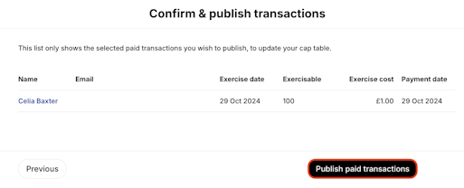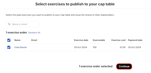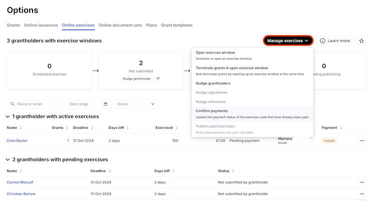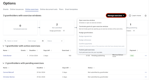 Once the grantholders have submitted their exercise, signed the relevant documents and paid for the exercise, you will be able to bulk Mark as paid and Publish.