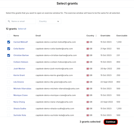 3. Select the grants by clicking the checkboxes and click Continue.