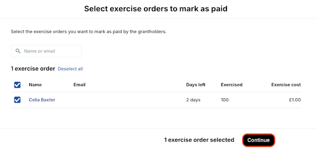 2. Select the exercise orders you want to mark as paid and click Continue.