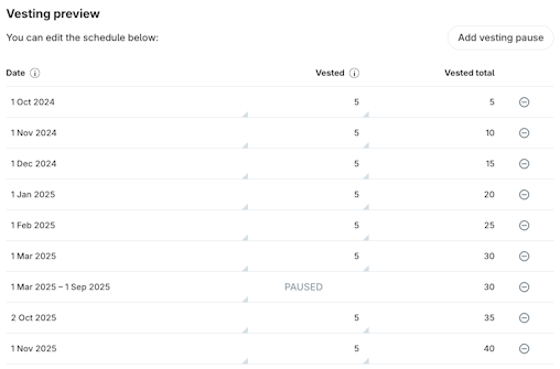 You may need to pause vesting to reflect an employee leave of absence, or for other operational reasons.