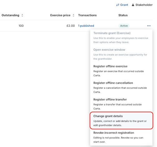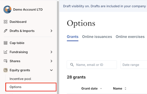 1. Go to Equity grants > Options (or applicable equity award type) > Grants.