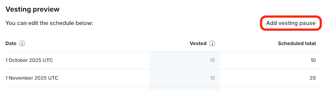 6. Click Add vesting pause.